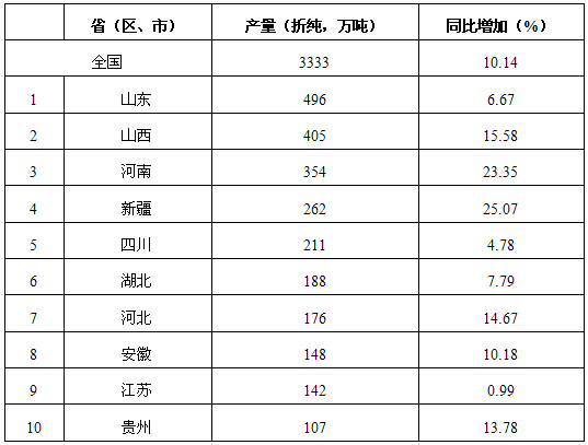 表3 2013年全国尿素产量前十名一览表