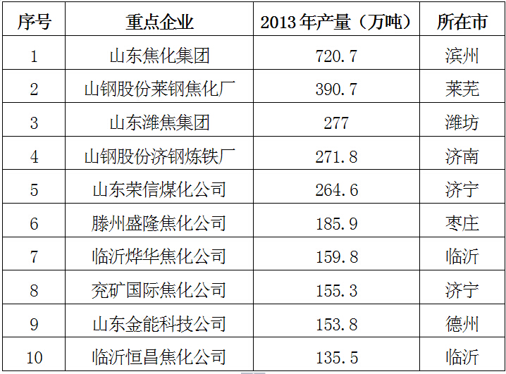 表4 2013年山东省焦炭骨干生产企业产能一览表